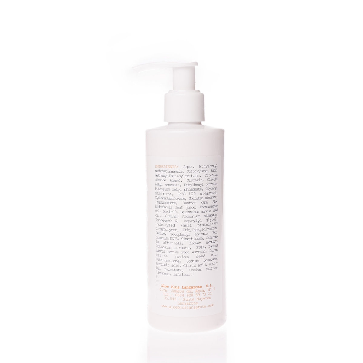 High solar protection milk with nice and soft texture of rapid absorption. Prolonged moisturizing action throughout the exposure, thanks to its aloe vera content. Indicated especially for clear skin phototypes.